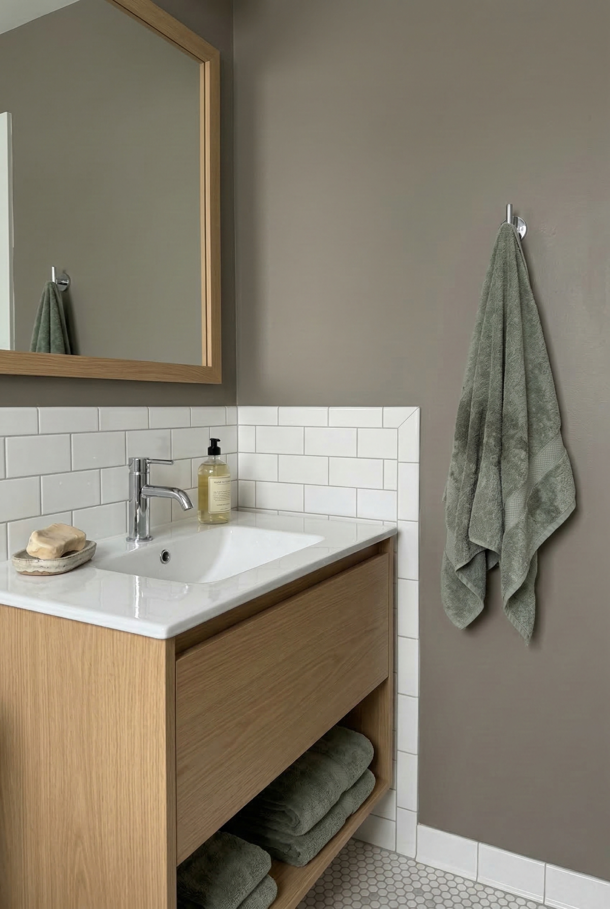 The green undertones become more visible in morning light, which gives east-facing bathrooms a fresh, earthy quality. For a cohesive look, add white towels and light wood accents to brighten the space without losing the cozy atmosphere Anonymous provides.