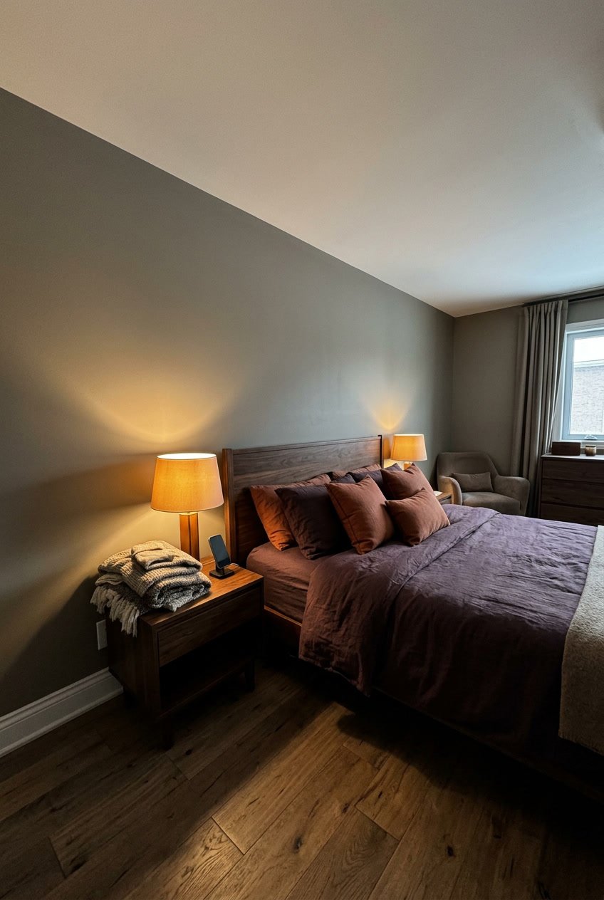 A single accent wall behind your bed also works if you’re hesitant about full-room coverage. This approach gives you the grounded feel of Anonymous while keeping the space lighter overall. Add textured throws and linen curtains to complete the warm, layered look.