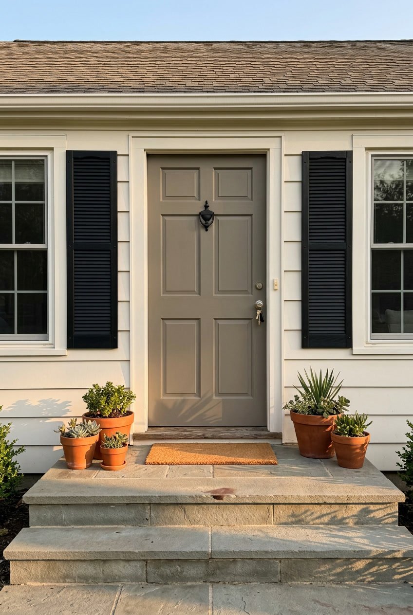 The color works equally well on modern farmhouse exteriors and traditional homes. If you have a brick exterior, Anonymous complements red or brown tones naturally. For a complete look, consider painting your shutters the same shade or choosing a coordinating neutral like Alabaster for trim.