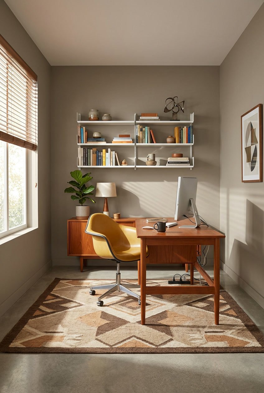 A home office painted in Anonymous feels focused and calm without being sterile. The depth of the color helps reduce visual distractions, which can improve concentration during work hours. You’ll want to make sure your office has enough natural or layered artificial light to prevent the space from feeling too dim.