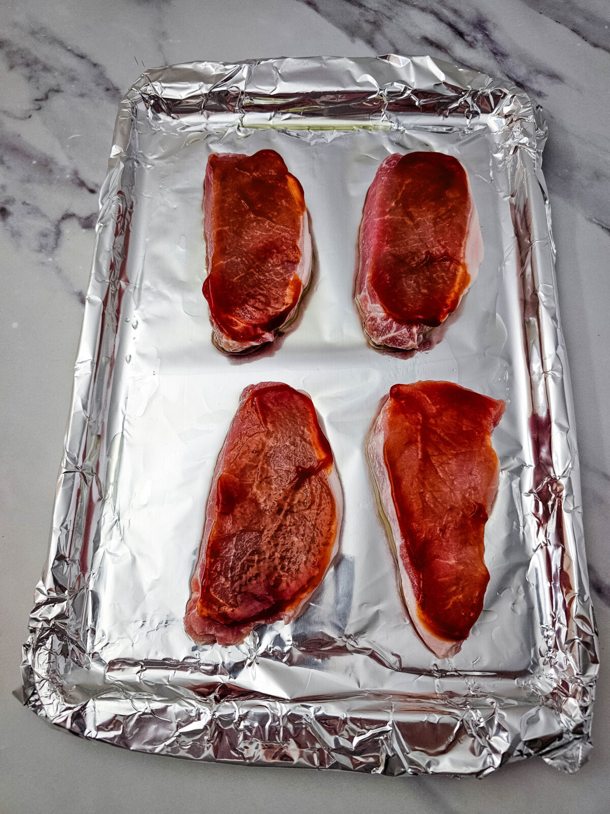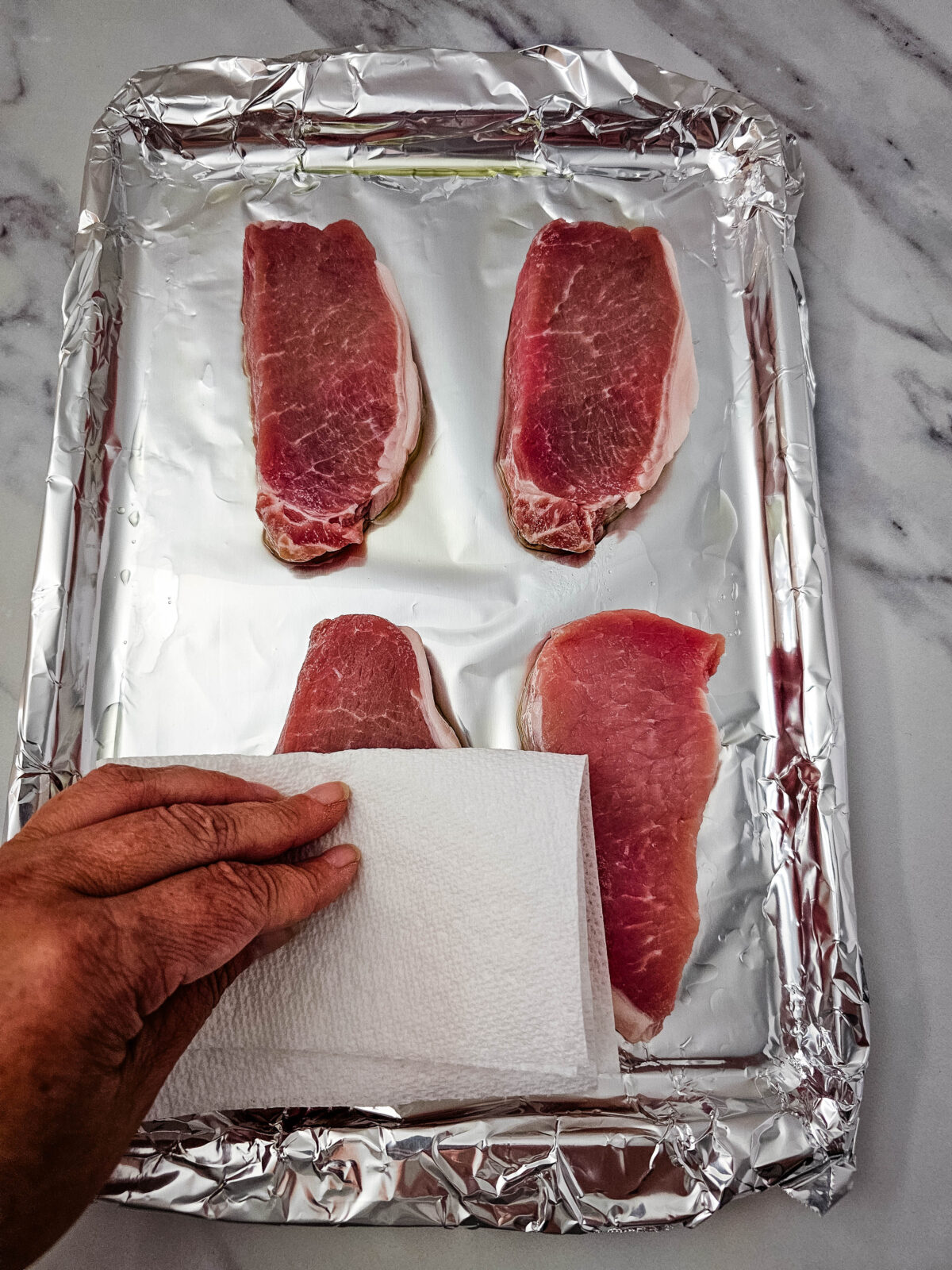 3. Pat the pork chops dry with a paper towel, and place on the prepared baking sheet