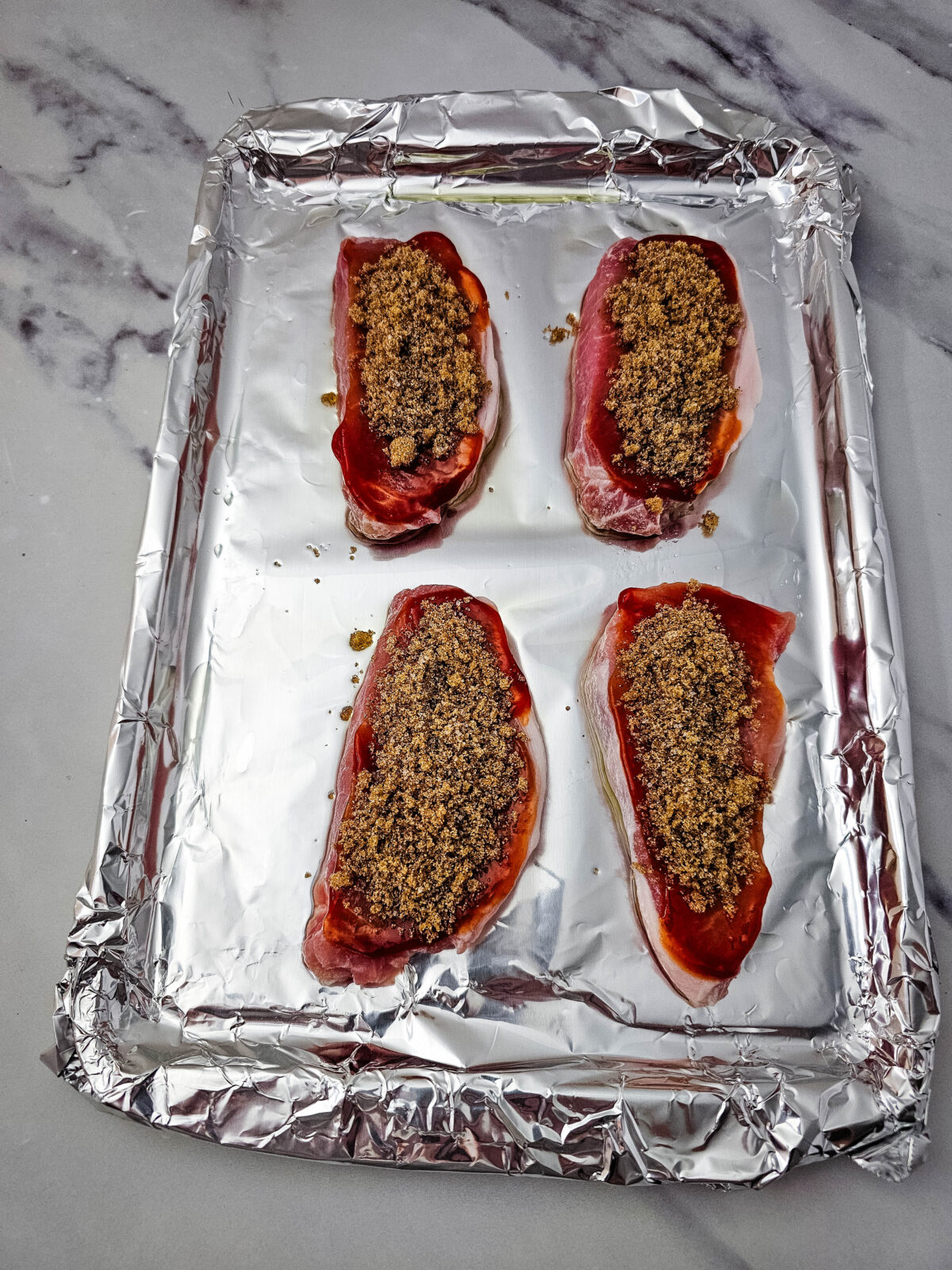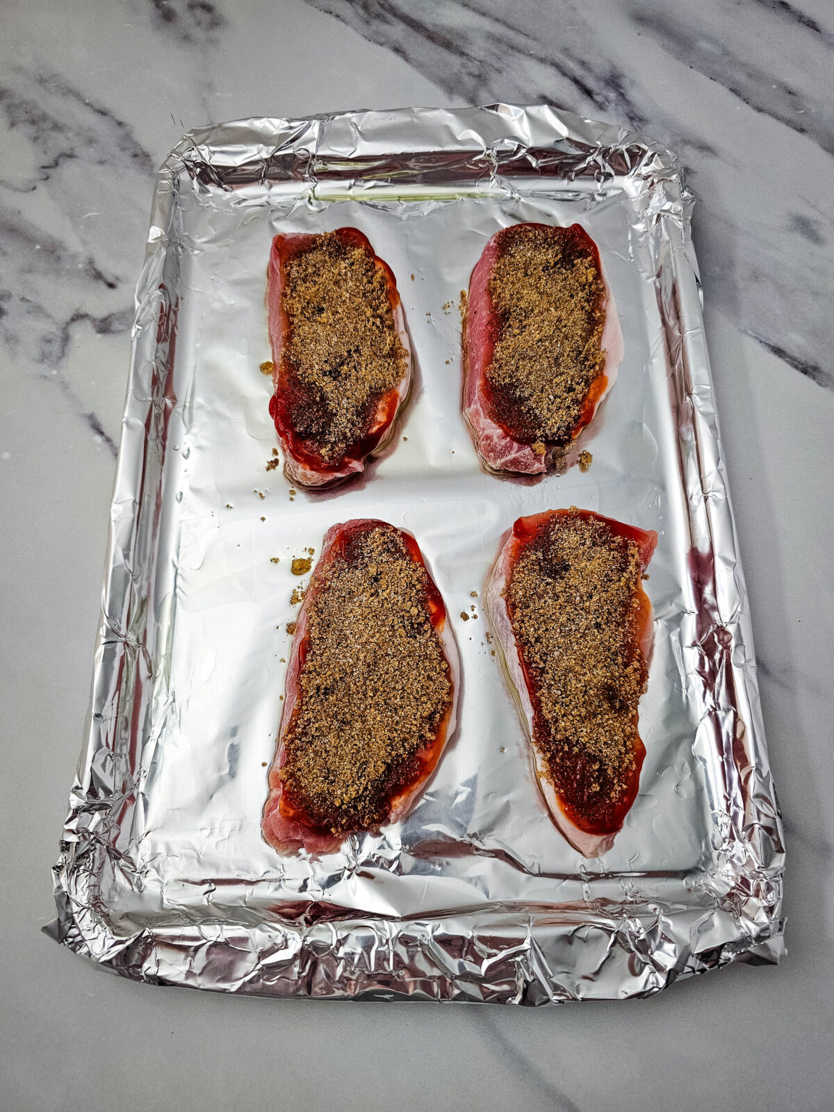 5. Spread ketchup over one side of the pork chops, then cover with the brown sugar mixture.