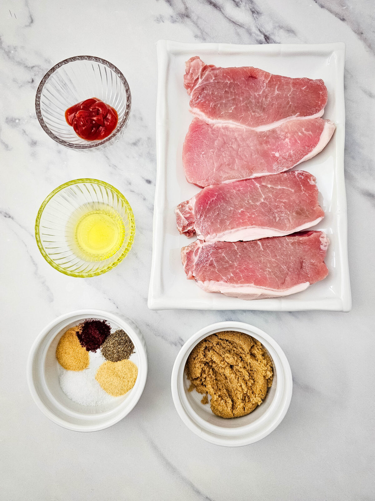 olive oil, pork chops, ketchup, brown sugar, seasonings