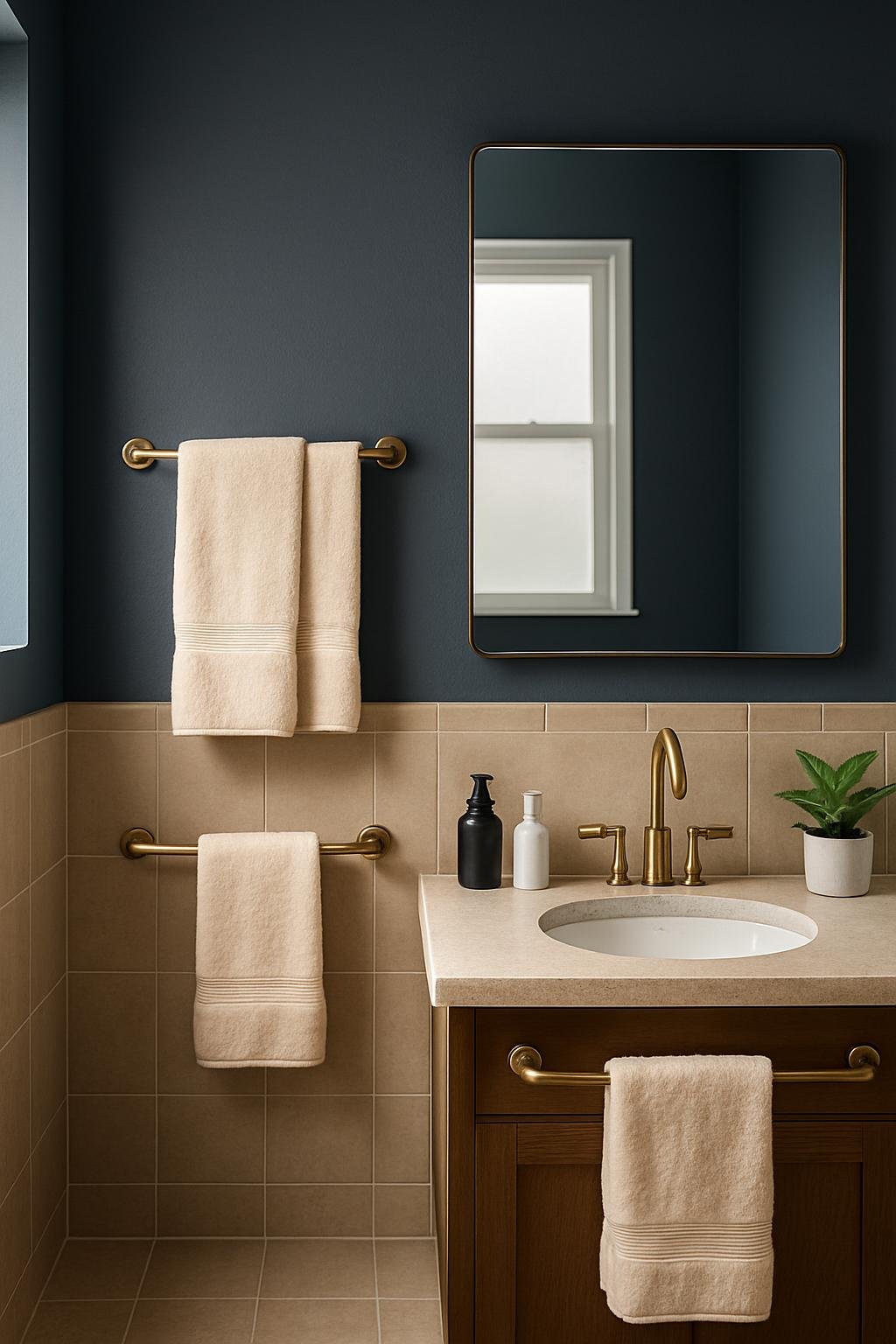 White towels and accessories really pop against these walls. Since the color absorbs light, you’ll want to add extra lighting.