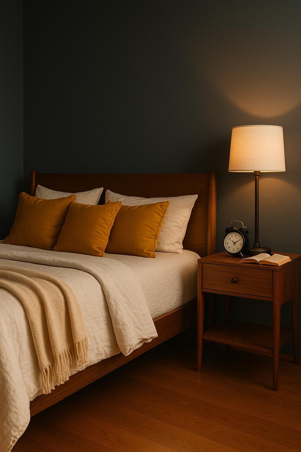 White bedding and neutral furniture look crisp against it. Wood nightstands or brass lamps add warmth.