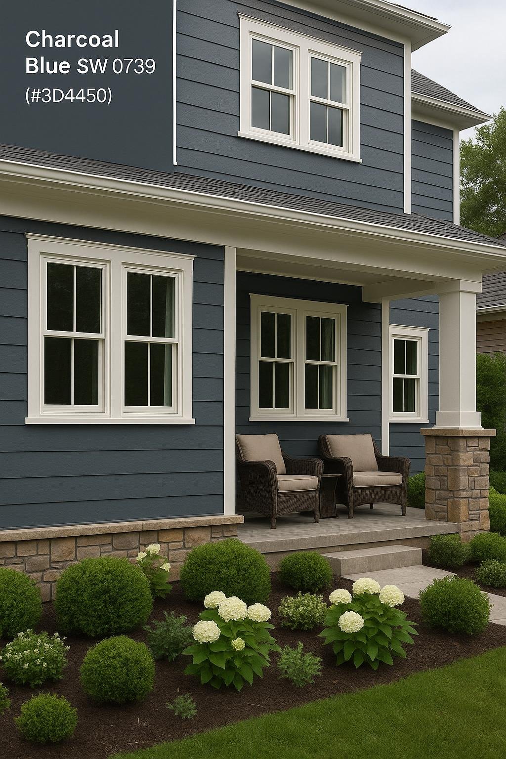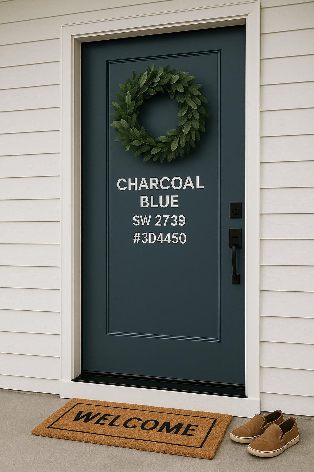 Charcoal Blue makes a front door stand out right away. It looks good with brick, beige siding, white exteriors, and even gray stone.