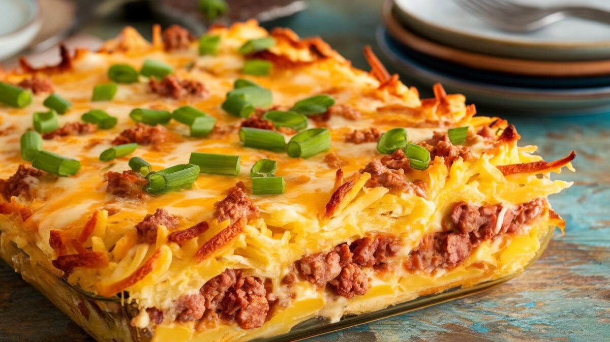 It combines crispy hash browns, savory sausage, and a blend of melted cheeses, creating a satisfying meal that everyone will enjoy.