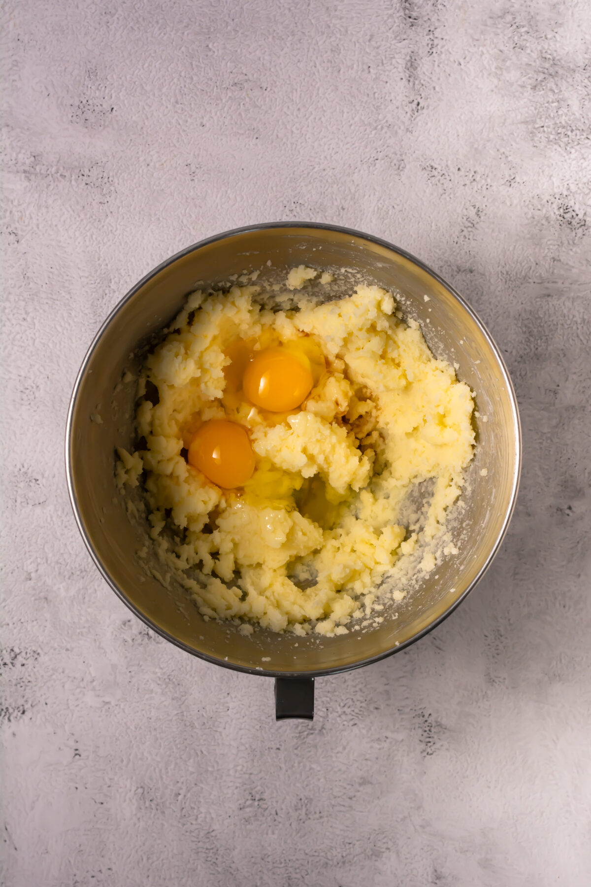 3. Add in the eggs and vanilla. Mix well, scraping down the sides often.