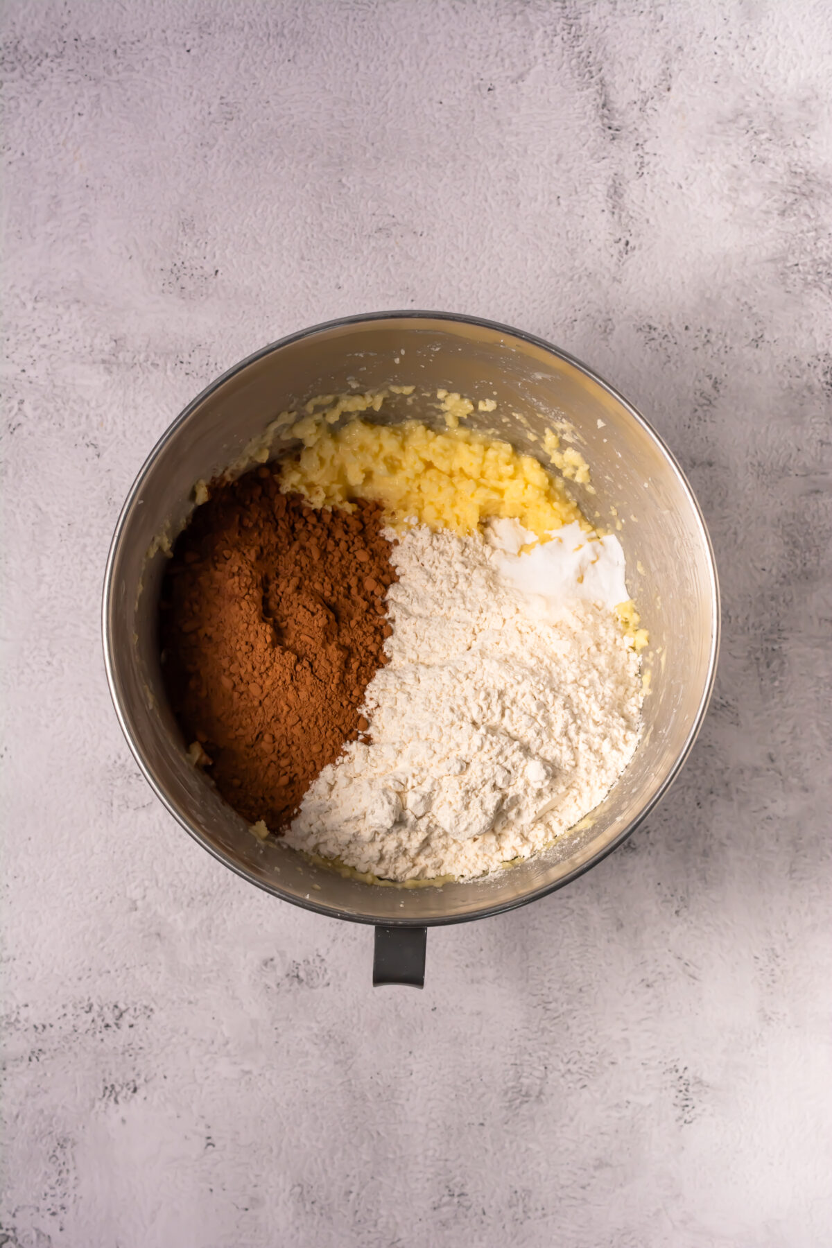 4. Add in the flour, cocoa, baking soda and salt. Mix thoroughly, scraping down the sides as needed.