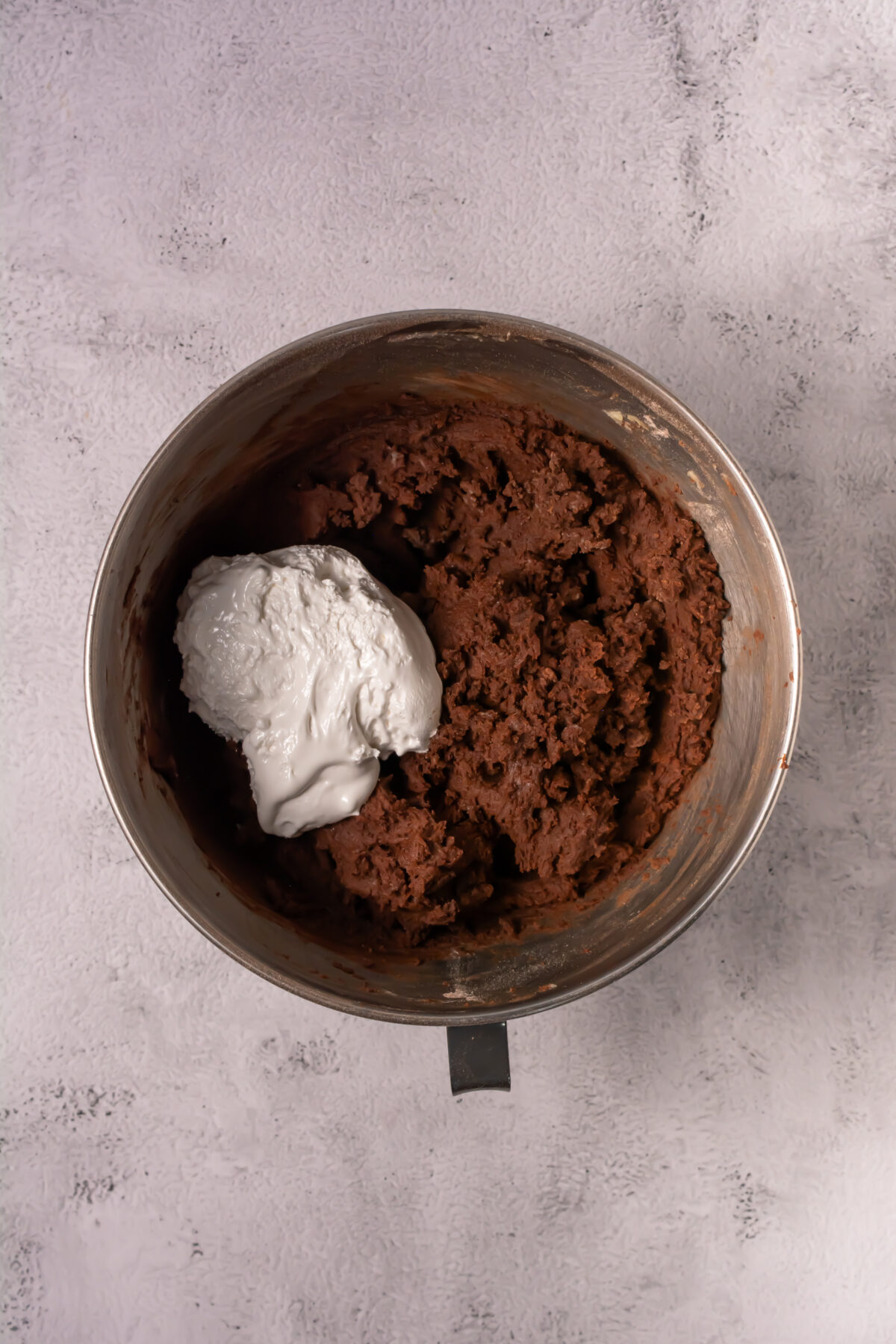 Add in the flour, cocoa, baking soda and salt. Mix thoroughly, scraping down the sides as needed.