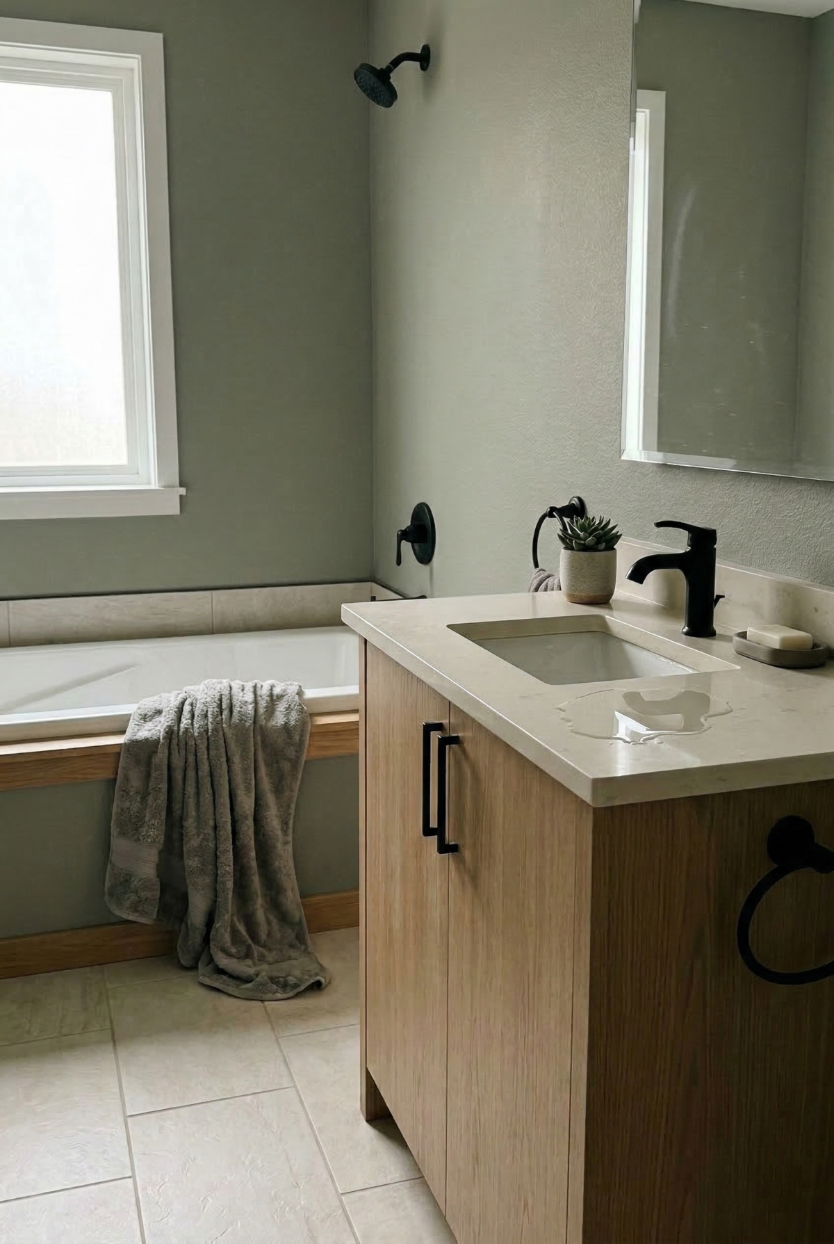 If your bathroom has limited natural light, the color will appear more gray and moody. You can balance this by adding warm brass or gold fixtures and plenty of white towels. The mid-tone LRV of 42 means it won’t make your bathroom feel too dark.