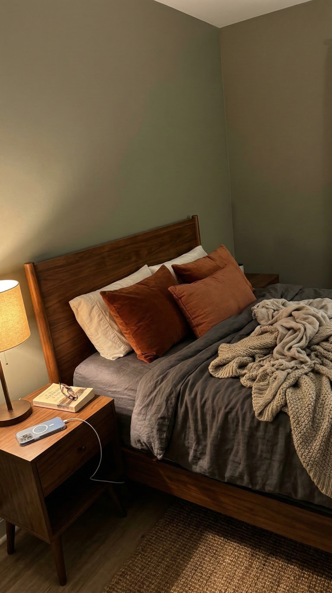 You can layer different textures to enhance the organic feel. Think jute rugs, wooden bed frames, and plants in ceramic pots. Warm lighting from bedside lamps will highlight the green tones in the evening, creating the perfect atmosphere for winding down.