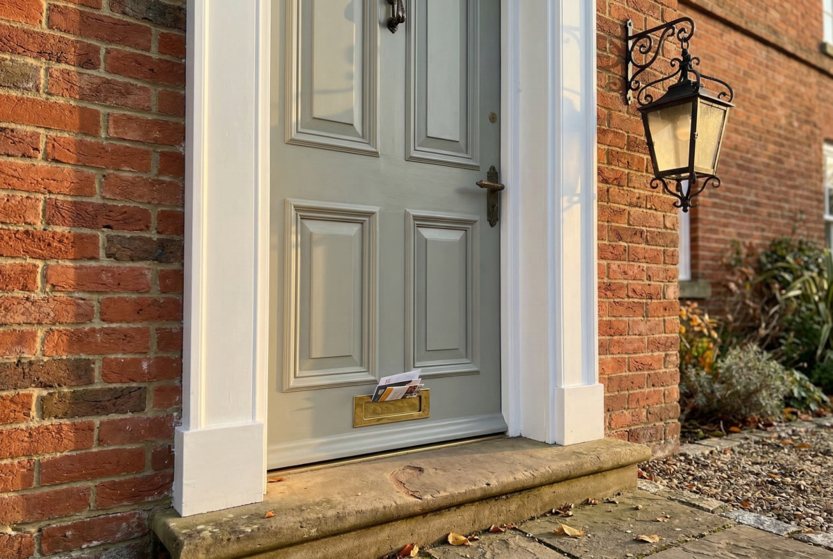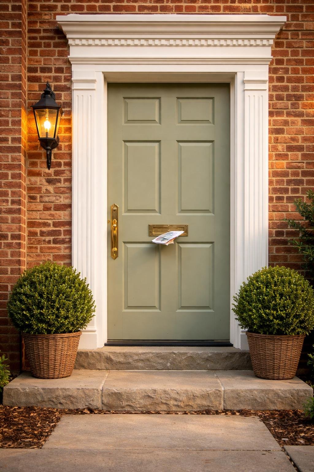 Your door will look different throughout the day as the light changes. Morning light might show more green, while evening light brings out warmer tones. This color pairs well with black or brushed nickel hardware for a modern look.