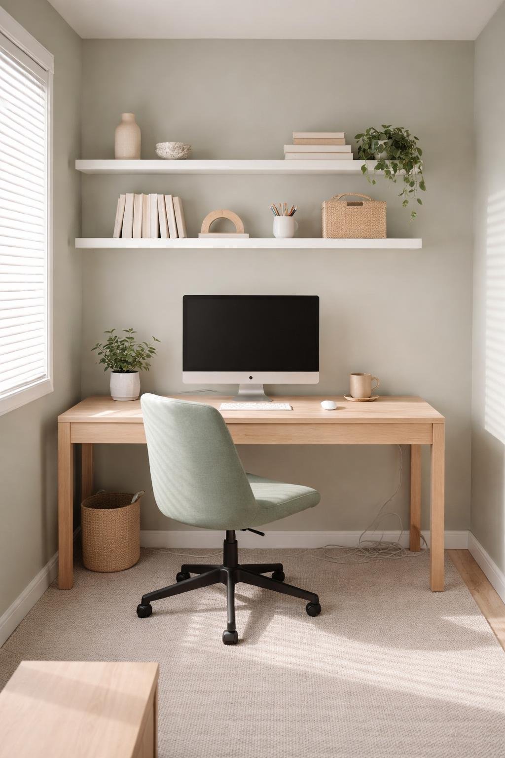 This color pairs well with dark wood desks, black metal shelving, and plants. You can add warmth with wooden picture frames or brass desk accessories. The mid-tone depth provides a good backdrop for video calls without being too dark or distracting.