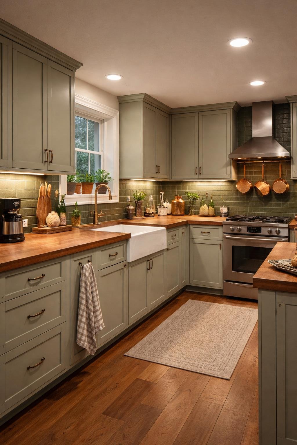You’ll get the best results when you pair these cabinets with warm materials. White or cream countertops, brass hardware, and natural wood floors all complement the green-gray beautifully. The color looks especially good on shaker-style cabinet doors.