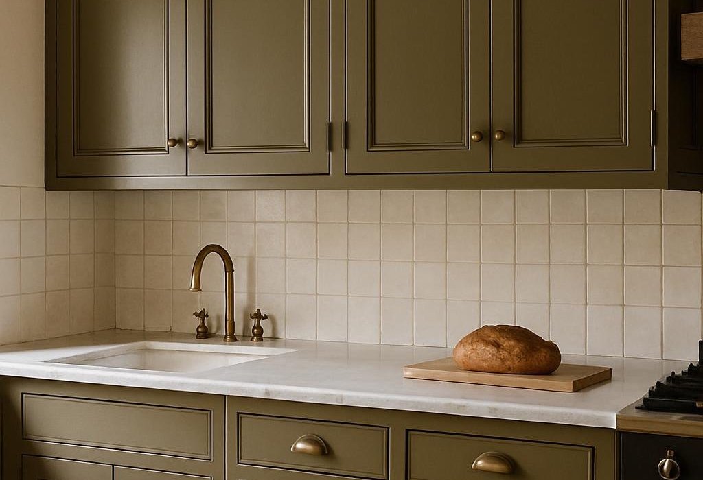 If your kitchen’s a bit dim, use Muddled Basil just on the island or lower cabinets. Pair with white uppers to keep things light. Open wood shelving or natural stone keeps the look fresh and highlights the earthy undertones.