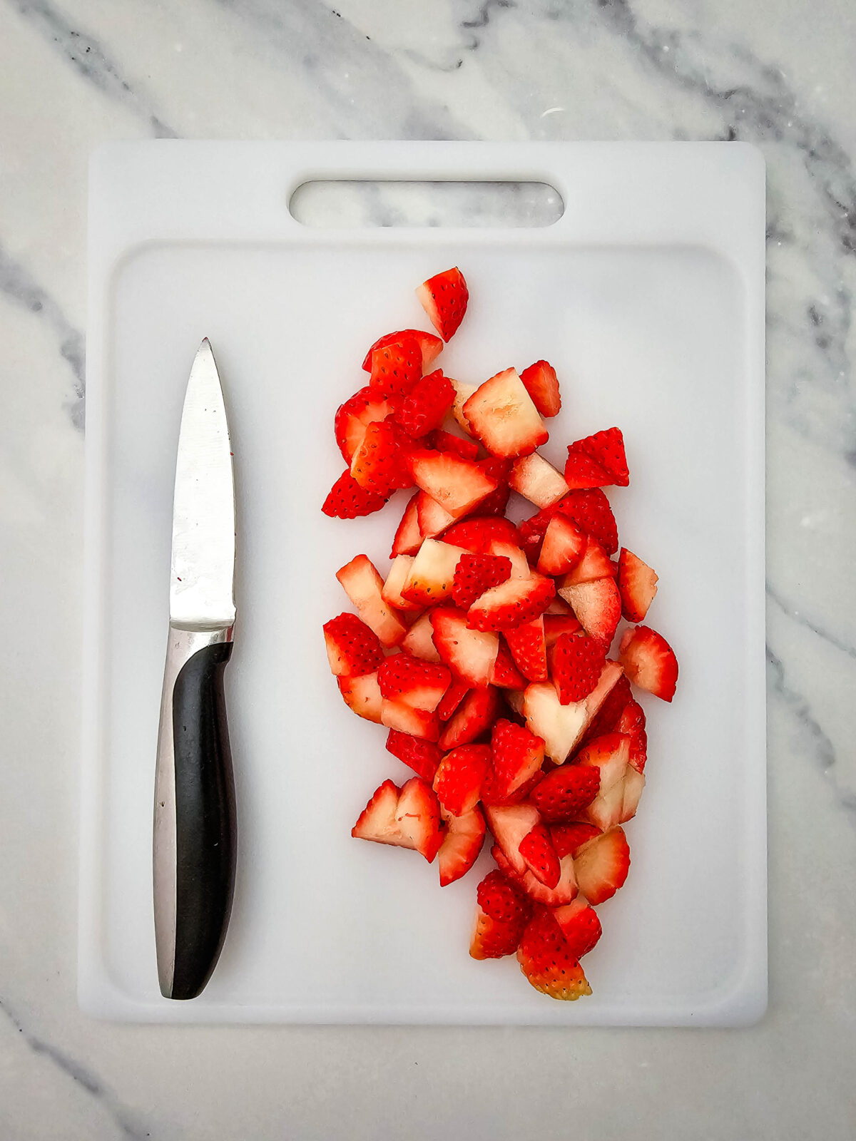 2. Cut the stems off the strawberries, then dice them into small pieces.