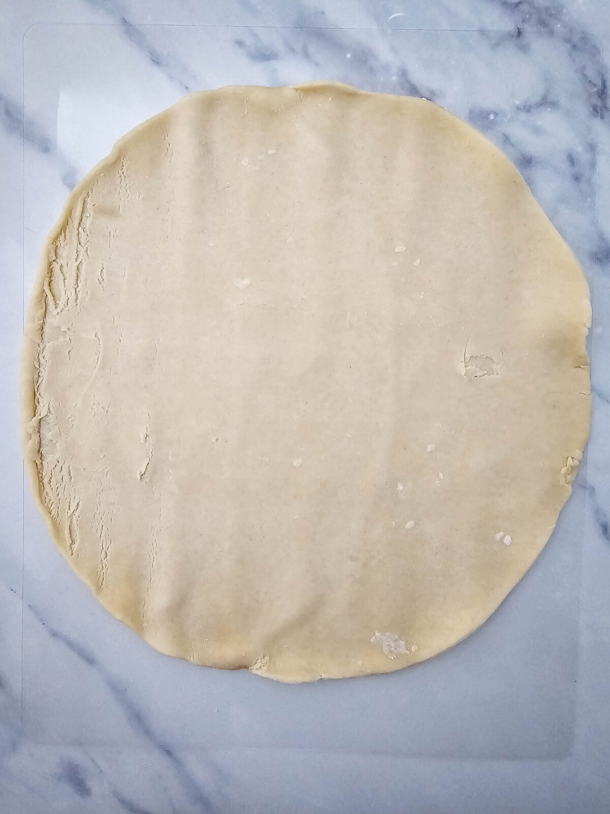 Unroll the pie crusts and use a mason jar lid or circle cookie cutter to cut our circles in the pie crust.