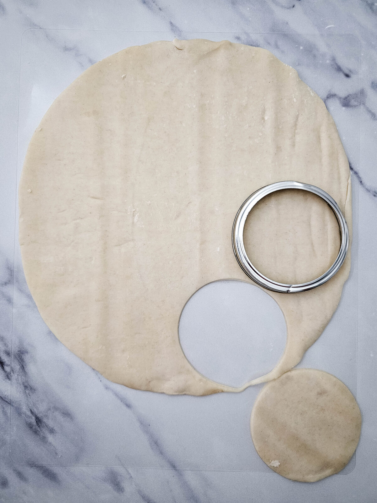 4. Unroll the pie crusts and use a mason jar lid or circle cookie cutter to cut our circles in the pie crust.