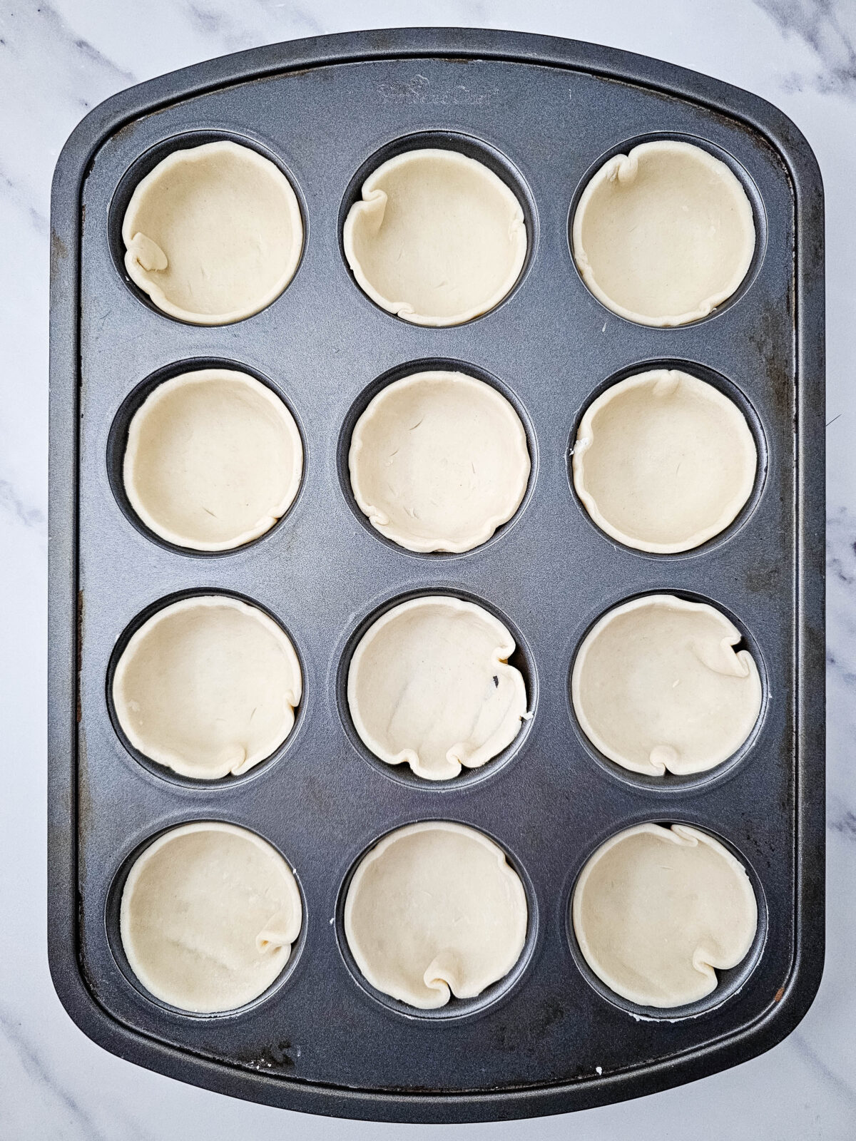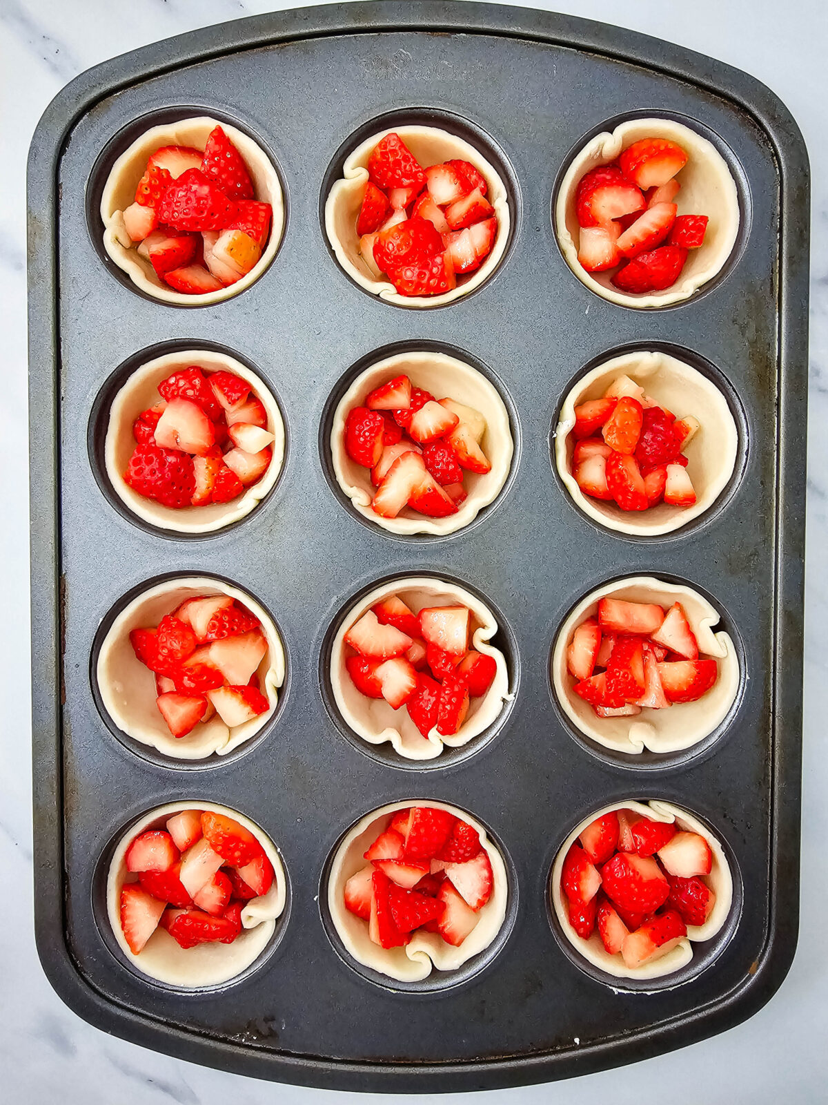 Add a heaping spoon ful of strawberry mixture into each mini pie crust.
