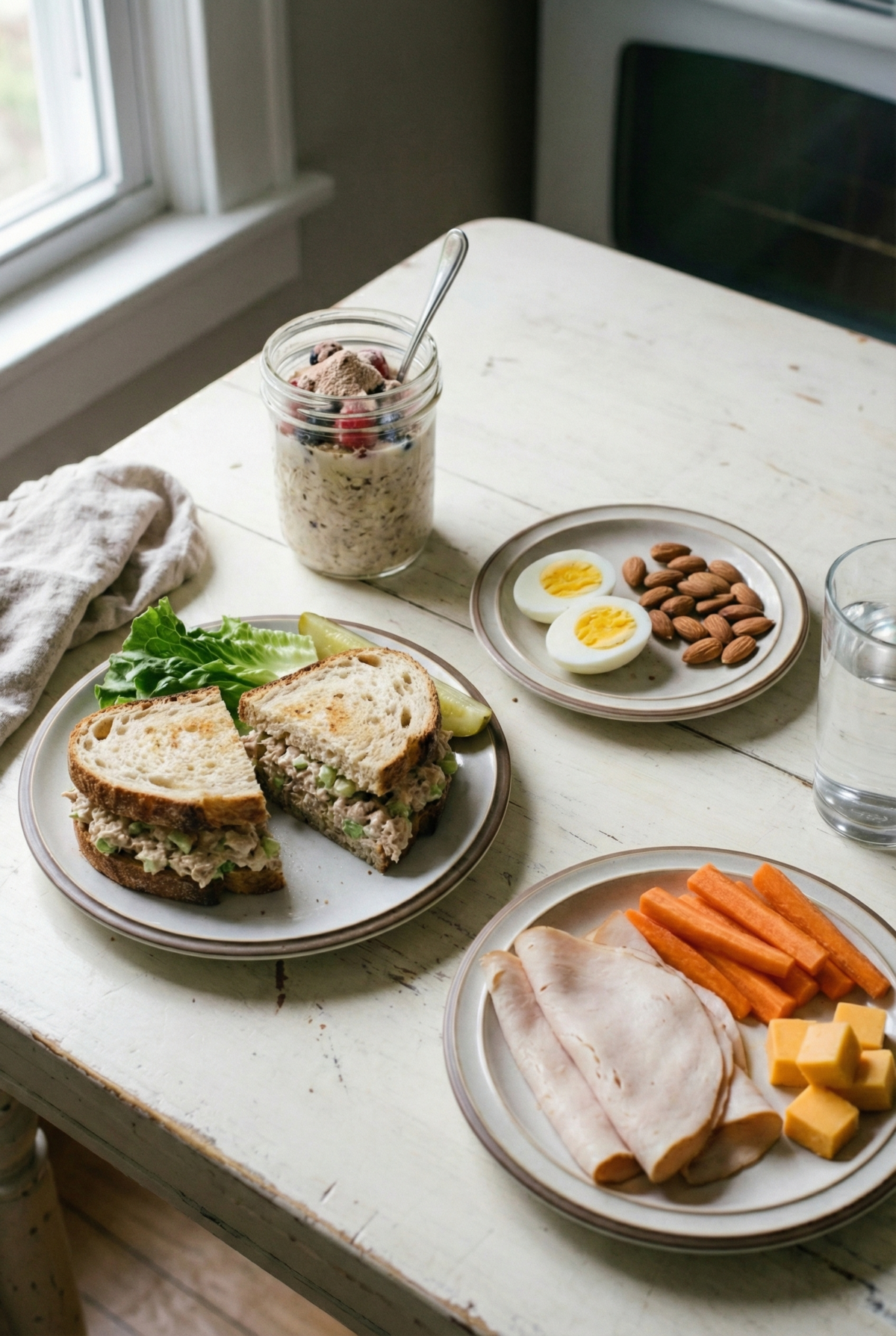Protein Staples: Whey isolate, Greek yogurt, canned tuna, shrimp, eggs.