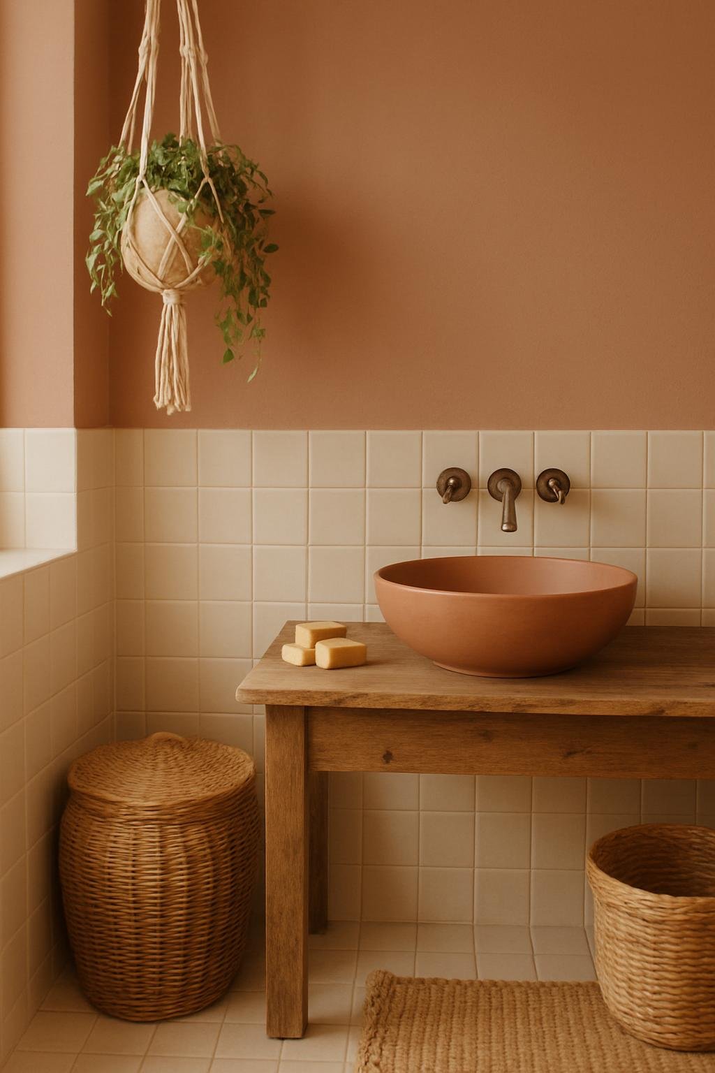 It’s not overly saturated, so it pairs well with natural materials like wood, stone, or clay tile. It adds warmth but won’t take over the room.
