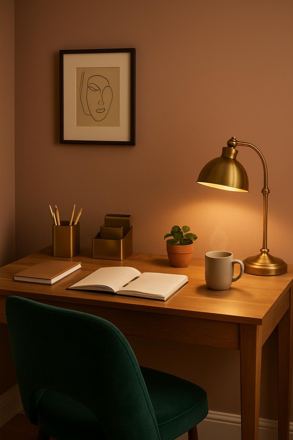 Cool-toned metals like brushed nickel or aluminum lamps add some contrast. Try it on one accent wall to define the workspace, and mix in woven bins or cork boards for a natural touch.