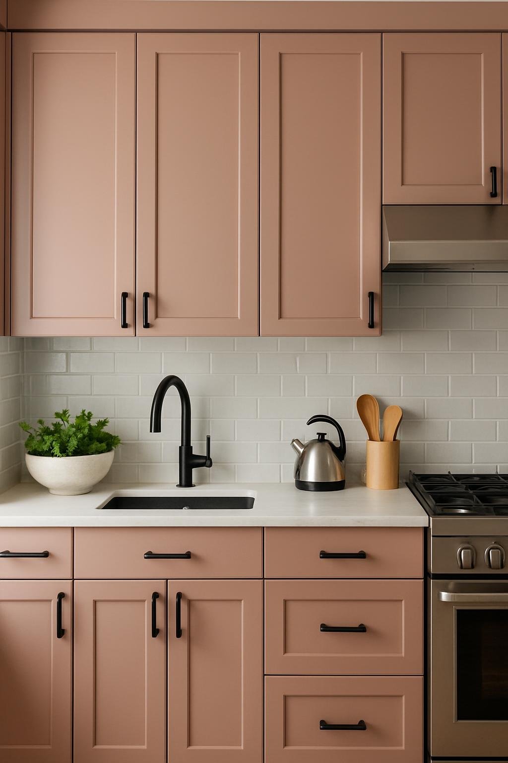 Light quartz counters or white ceramic tile reflect light and soften the color’s earthy side. Toss in cotton towels or woven baskets for a cozy, balanced finish.