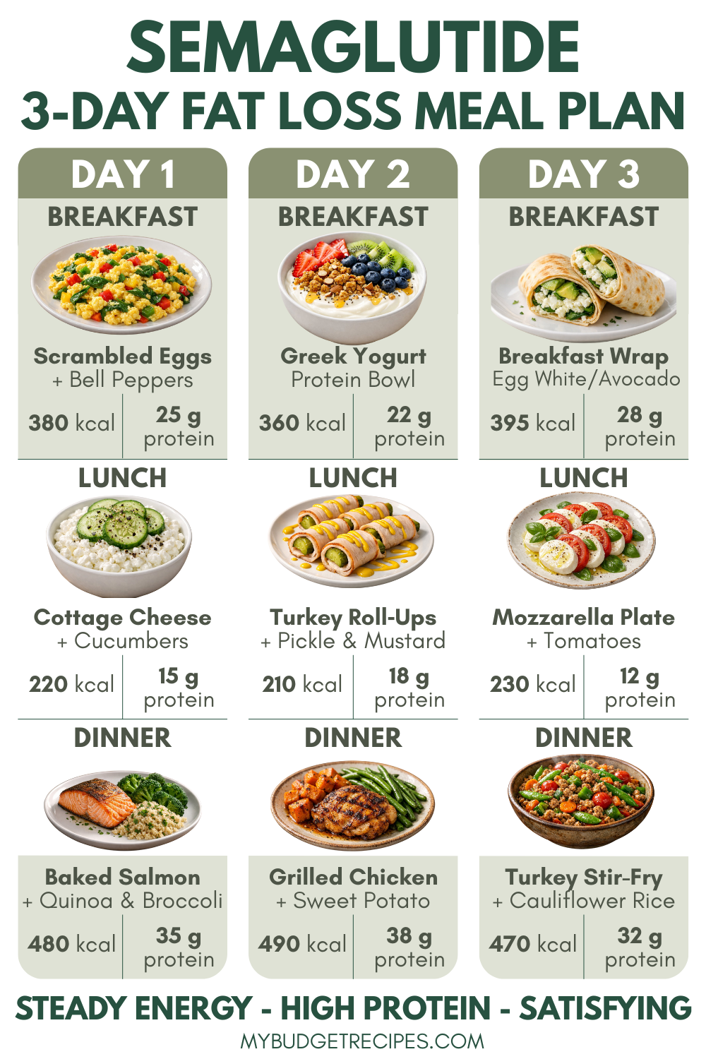 Day 3 focuses on protein-rich meals that keep you full while minimizing carbs to help manage blood sugar levels. Each meal provides lean protein sources paired with healthy fats and non-starchy vegetables to support your weight loss goals on Semaglutide.