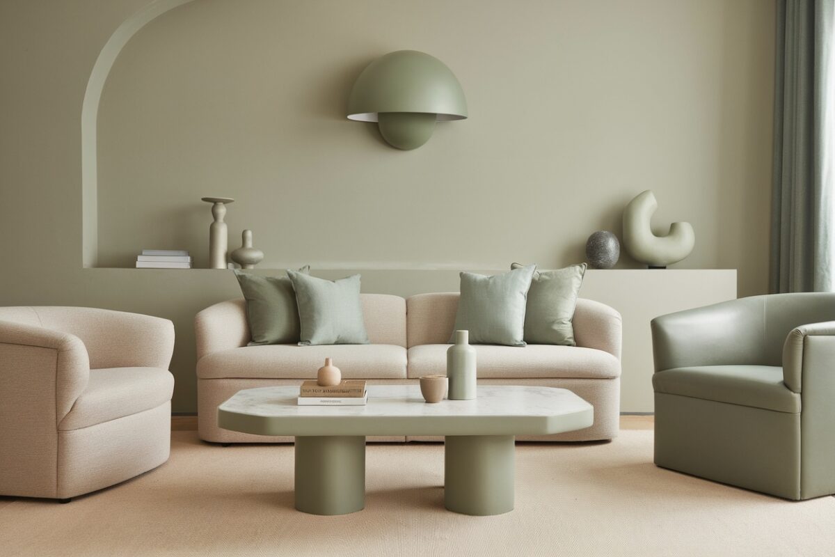 In south-facing rooms with warm light, the gray undertones become more visible, helping to balance the green and create a neutral backdrop.